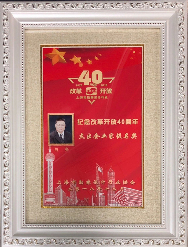 我司應(yīng)邀出席本次盛會。會上公布了“上海市勘察設(shè)計行業(yè)紀(jì)念改革開放40周年突出貢獻獎”的各獎項獲獎名單。我司多年來始終堅持科技創(chuàng)新,走專業(yè)化、特色化發(fā)展道路,在此次評選中喜獲殊榮,獲評“創(chuàng)新典范企業(yè)”,董事長白亮榮獲“杰出企業(yè)家提名獎”。