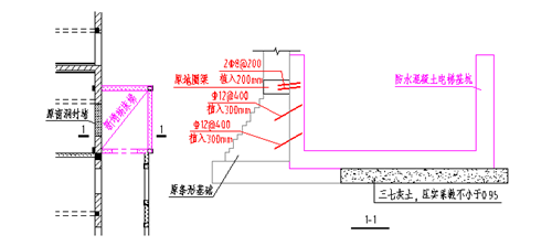 綜合樓東側(cè)新增病床梯,由于東側(cè)緊鄰馬路,病床梯需要緊貼綜合樓外墻設(shè)置,電梯基坑與原有外墻條基發(fā)生碰撞,如果將原有條基拆除、在電梯基坑以下以新建條基,施工難度比較大,上面為預(yù)制樓板,安全不易保證,經(jīng)過比較,最后將電梯移到正對(duì)原有窗洞口的位置,從而減少并分散對(duì)原有直接傳力外墻基礎(chǔ)的影響,并通過植筋的方式將新增混凝土基坑與原有條基連成整體,共同受力,詳見下圖。