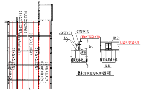 阜城當(dāng)?shù)赜泻芏嗌a(chǎn)夾芯彩鋼板的工廠,由于就地取材造價(jià)低廉,被當(dāng)?shù)氐暮芏嘟ㄖ捎?,入鄉(xiāng)隨俗,我們?cè)诰C合樓的新增三層頂也采用了夾芯彩鋼板輕鋼屋面,屋面檁條為C形卷邊冷彎薄壁型鋼,結(jié)構(gòu)布置如下圖所示。