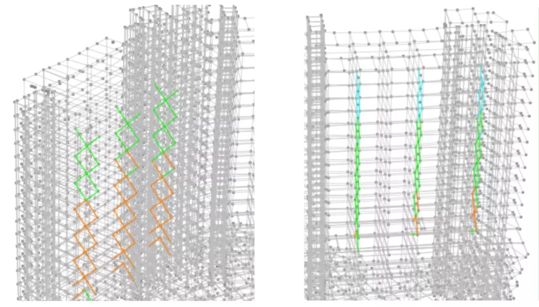 為此,我們在相應(yīng)位置設(shè)置屈曲約束支撐(BRB)。BRB是由芯材、約束芯材屈曲的套筒和位于芯材與套筒間的無粘結(jié)材料及填充材料組成的一種支撐構(gòu)件。BRB僅芯板與主體框架連接,所受荷載完全由芯板承擔(dān),外套筒和填充材料約束芯板受壓屈曲。因此BRB沒有受壓穩(wěn)定問題,其在風(fēng)載與小震下構(gòu)件承載能力比普通支撐提高 2-10 倍。BRB在滿足承載力的情況下,其截面大大減小,同時滿足剛度適宜的要求。屈曲約束支撐從裙房最上一層開始設(shè)置,部位為7-19層??紤]到7層通道的通行要求,局部人型支撐形式調(diào)整為單斜桿支撐形式。
