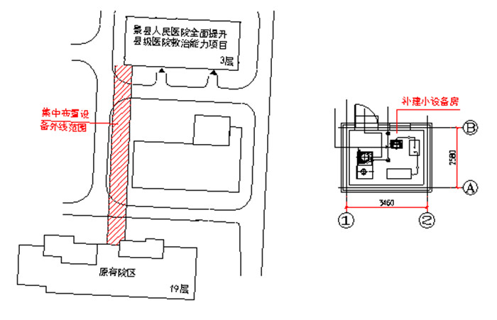 由于感染樓規(guī)模不會太大,而且特殊時期需要快速施工、政府投資數(shù)額有限,所以一般不會設(shè)地下室,與原有院區(qū)共用設(shè)備房,這時各專業(yè)的室外管線在滿足規(guī)范的情況下應(yīng)盡量集中到一起布置,這樣可以盡量少的影響現(xiàn)有的廣場和道路等,便于施工。各設(shè)備系統(tǒng)要選擇與原有院區(qū)同型號的,免得出現(xiàn)不兼容問題。如果原有院區(qū)的設(shè)備用房不能完全滿足新建感染樓的要求,則需要補建設(shè)備用房,一般不能將設(shè)備放到感染樓內(nèi),補建設(shè)備用房通常很小就夠用。下圖是感染樓主要管線到原有院區(qū)的路由及補建的獨立小設(shè)備用房。
